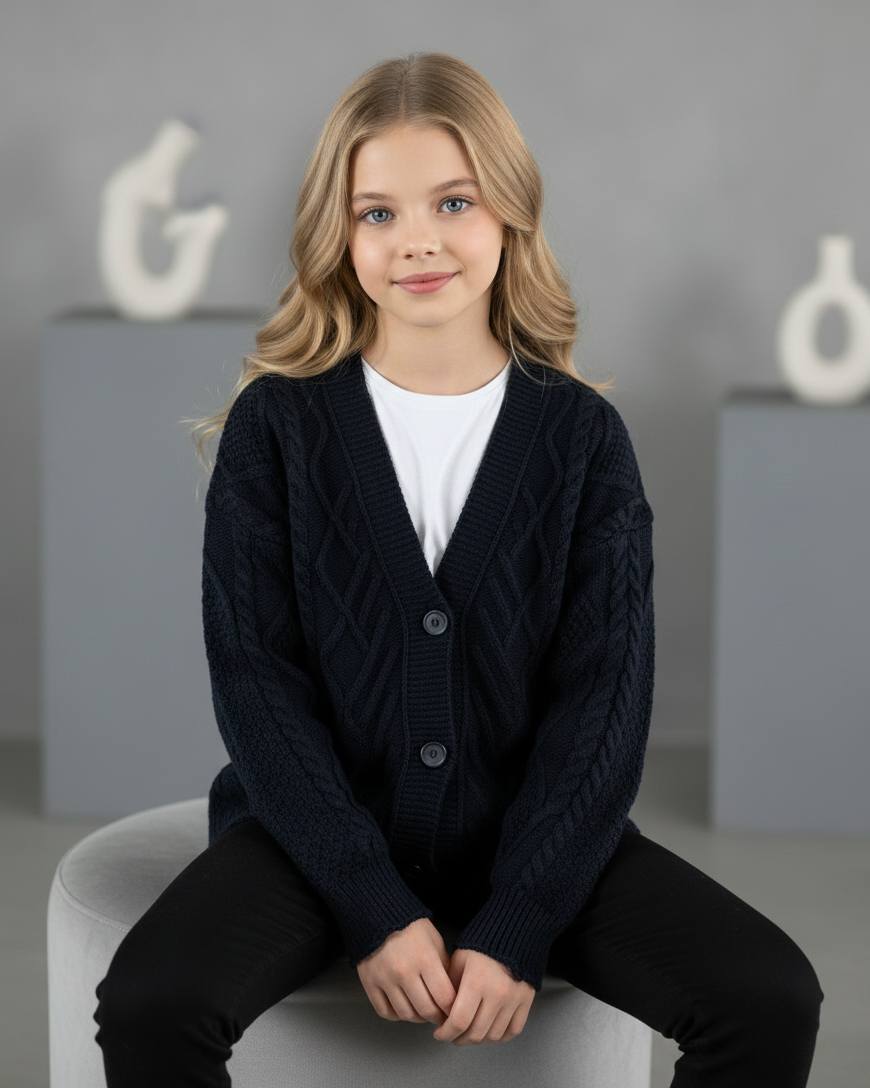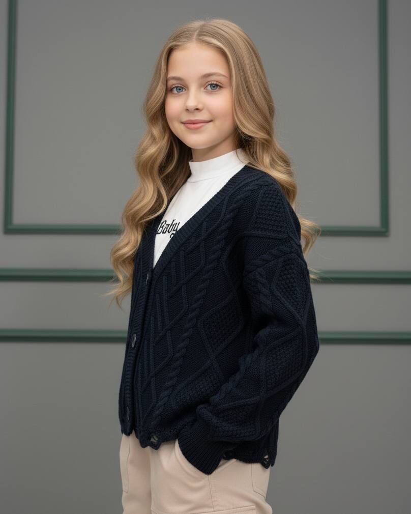 Akrilik iplikten üretilen bu kız çocuk triko hırka, saç örgü ve geometrik desen detaylarıyla şıklığı bir araya getiriyor. Yırtık efektli eteği bahar ayları için ideal, hem rahat hem de tarz bir görünüm sunuyor. Günlük kullanıma uygun, yumuşak ve sıcak tutan özel bir tasarım.