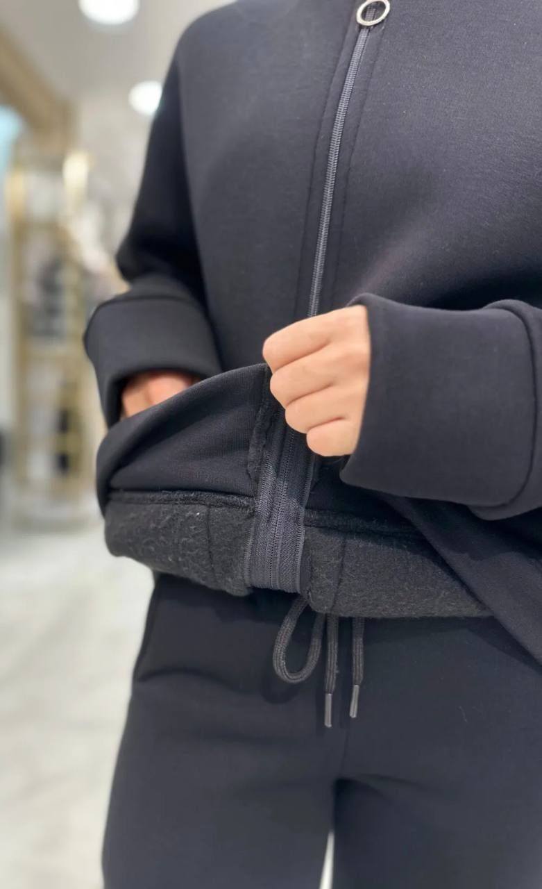 Üç iplik içi şardonlu kumaştan üretilen bu spor kışlık takım, üst kısmında fermuarlı ve iki büyük ceple tasarlandı. Pantolon kısmında ise toplam dört cep bulunuyor, böylece fonksiyonellik ve rahatlık bir arada sunuluyor. Soğuk havalar için ideal, şık ve kullanışlı bir tercih.
